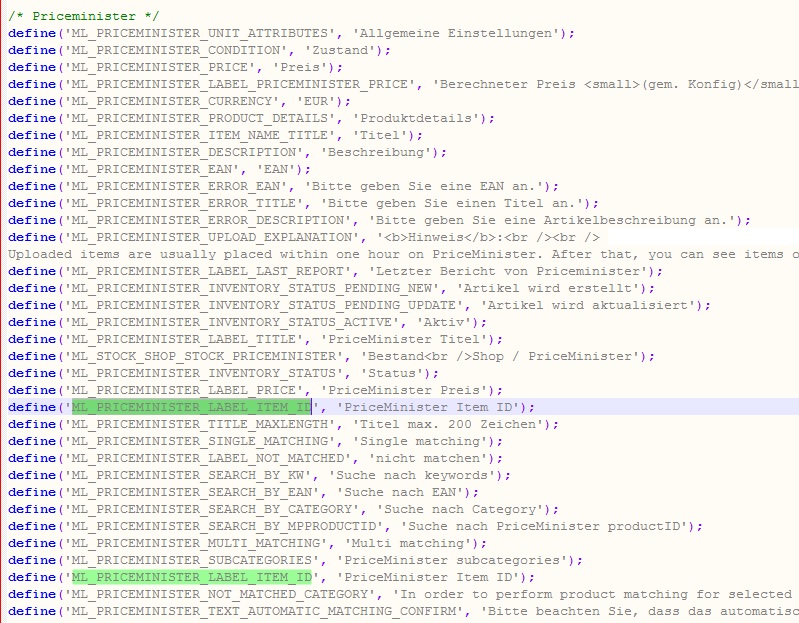 In der Datei "includes/external/magnalister/lang/german.php" ist die Konstante ML_PRICEMINISTER_LABEL_ITEM_ID doppelt angelegt.