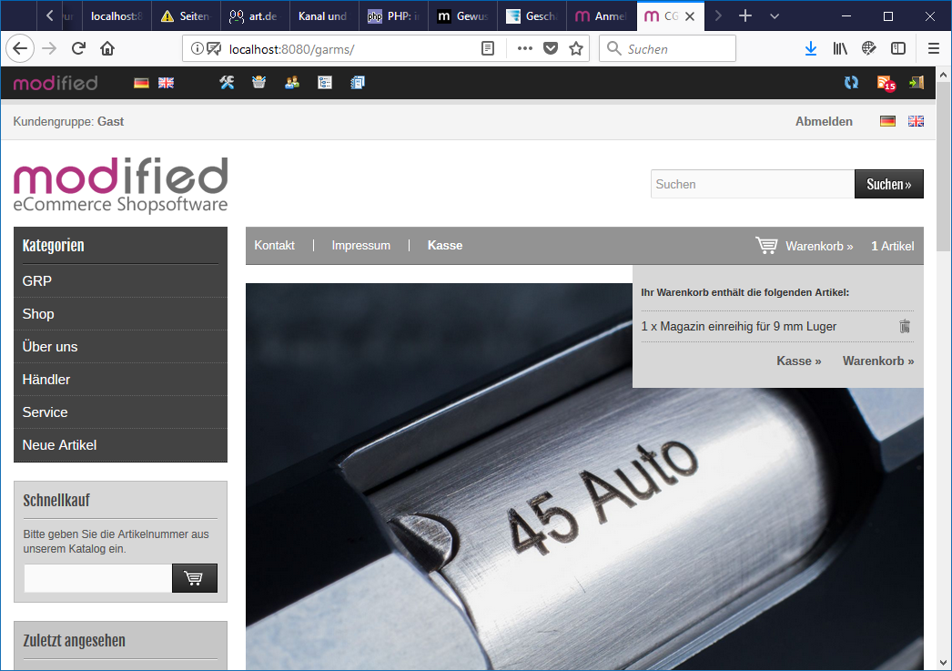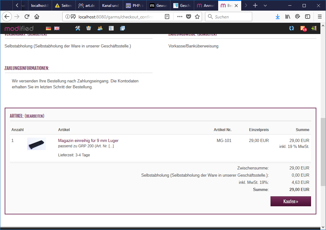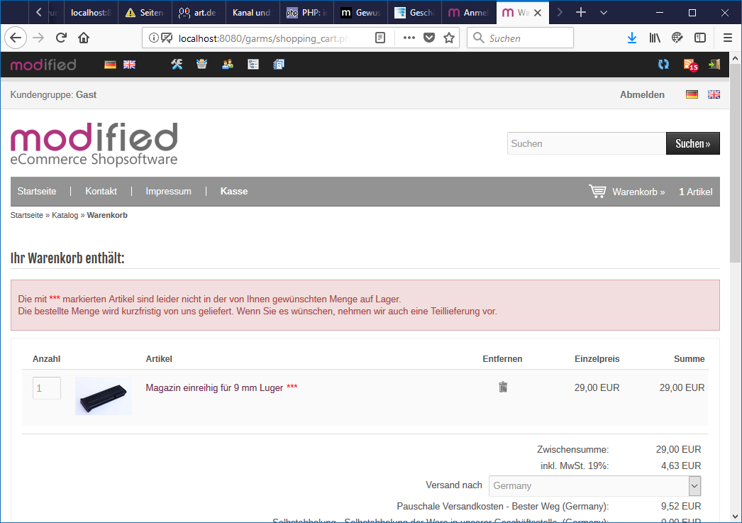 Artikel in den Warenkorb => keine Anzeige das Ware nicht vorrätig
