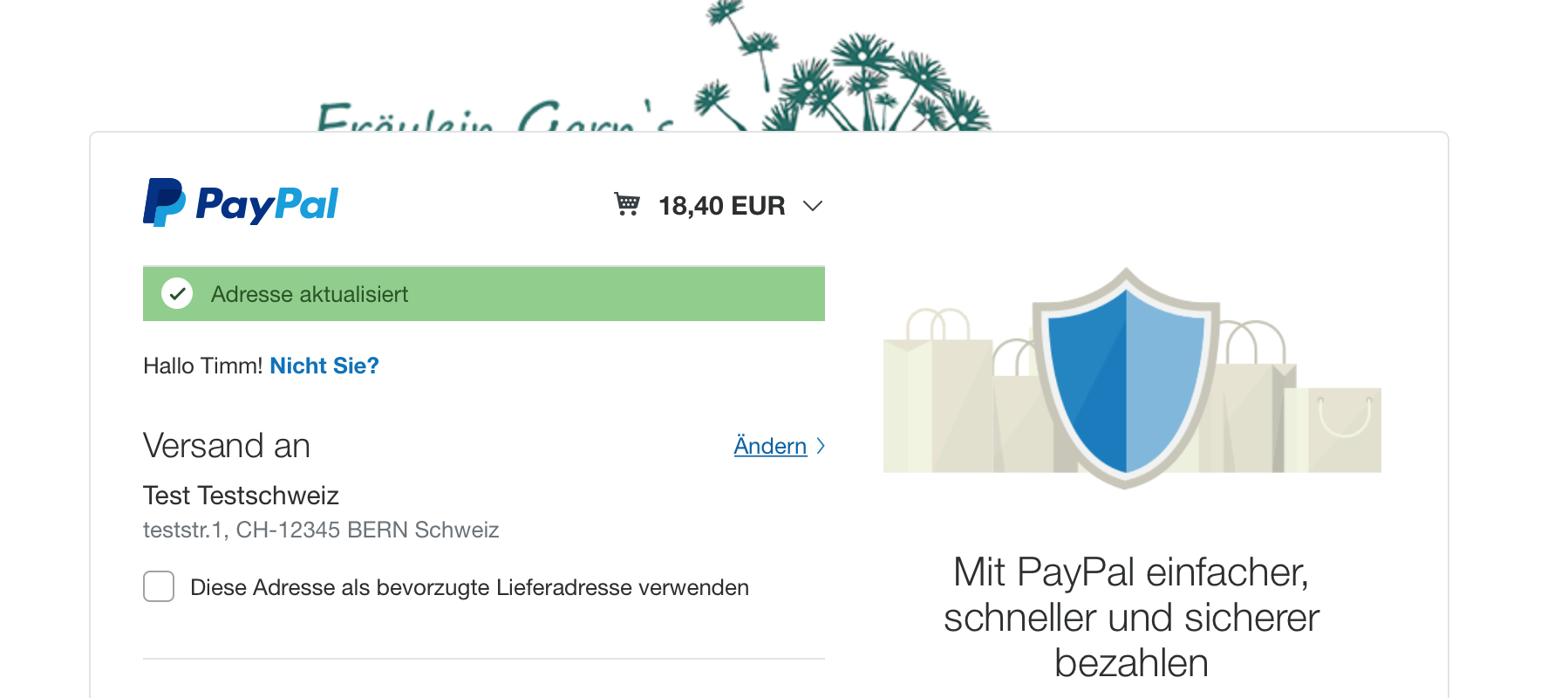 deutsche Adresse mit Schweizer überschrieben mit Paypal Plus am 7.8.2019