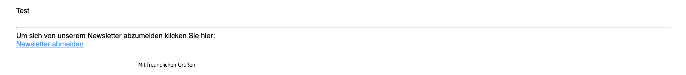 Standardmäßig wird an den Newsletter die Signatur bereits angehängt. Wenn Sie die Signatur jedoch anders formatiert über den Editor einfügen möchten, dann fügen Sie bitte an das Ende des Newsletters den Code [NOSIGNATUR] (inkl. eckiger Klammern) ein.