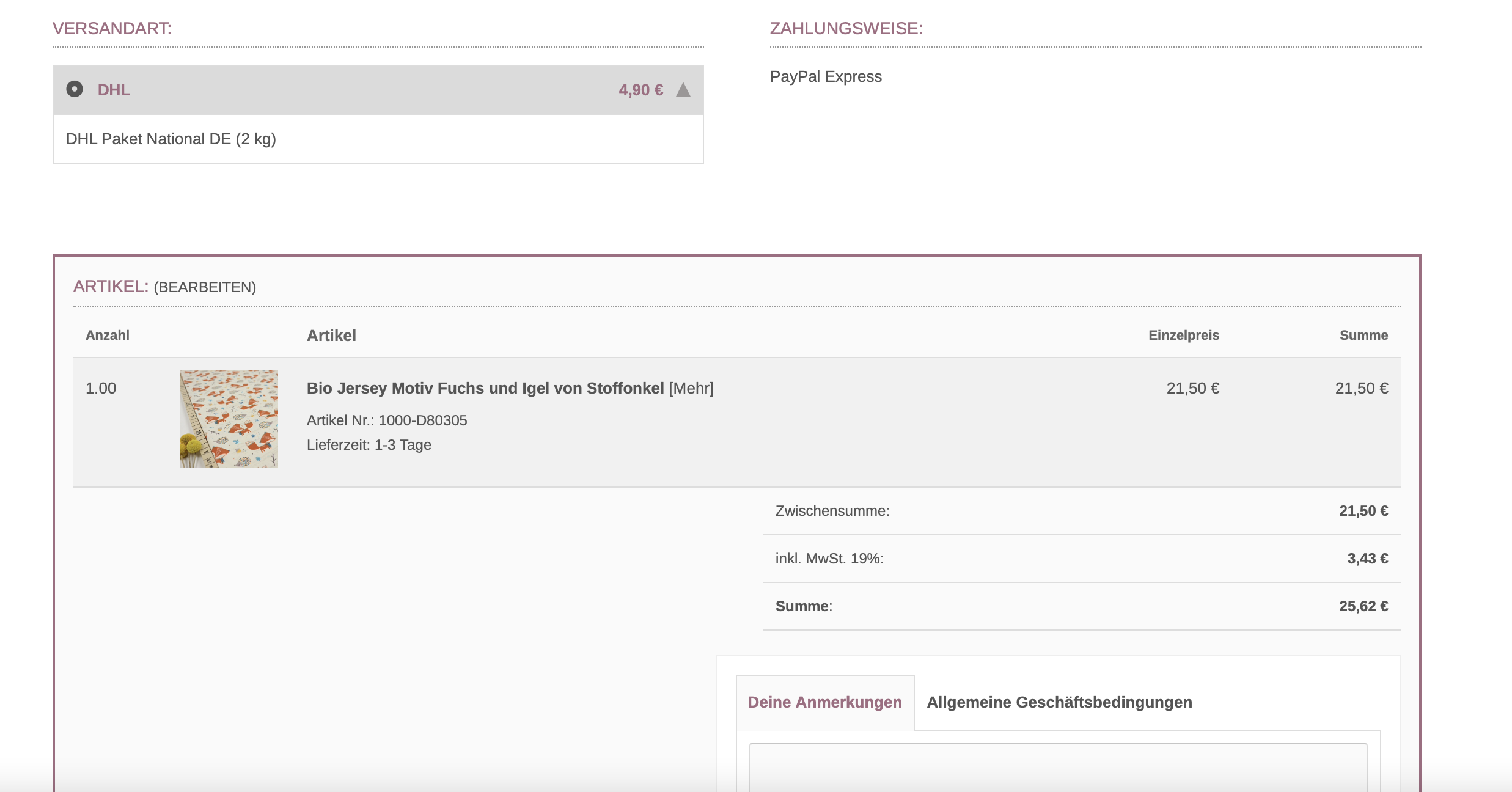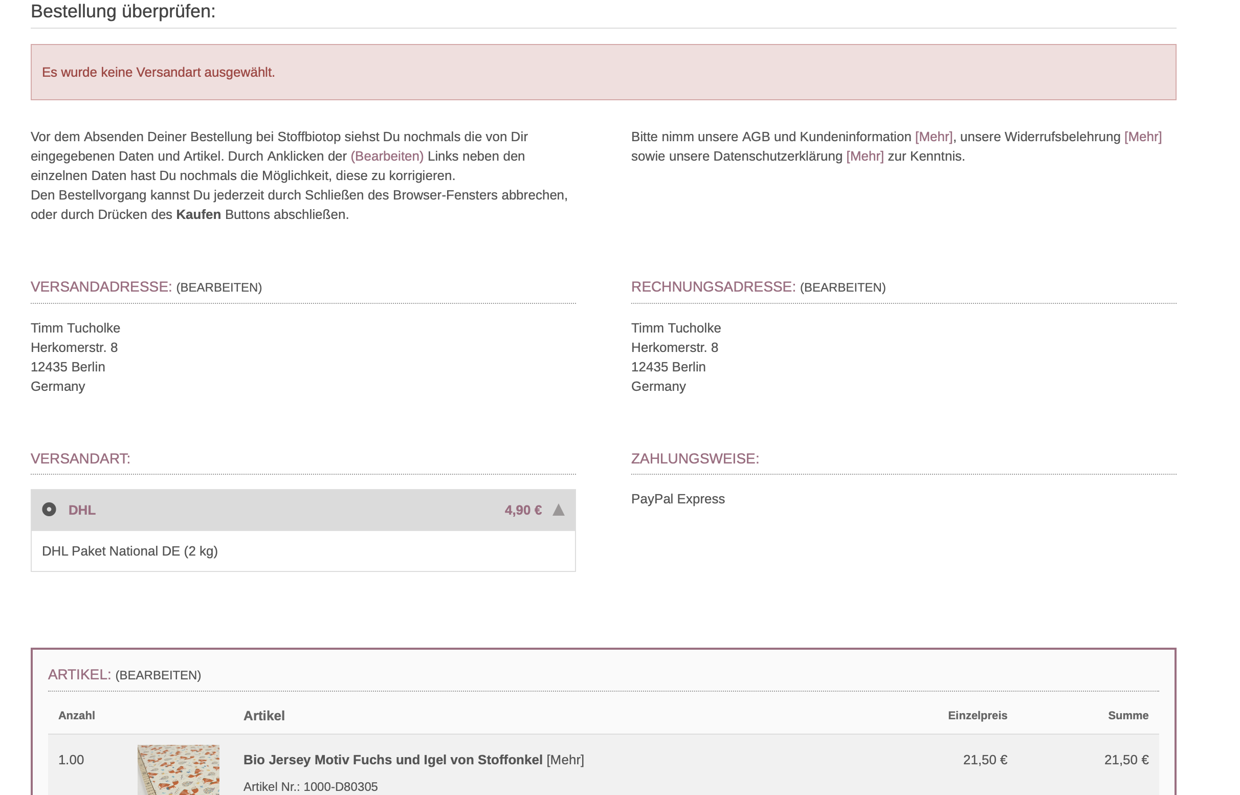 P.S.: Wenn nur eine Versandart im Shop aktiv ist, dann wird die Versandart automatisch bestätigt und es ist kein Button mehr notwendig.