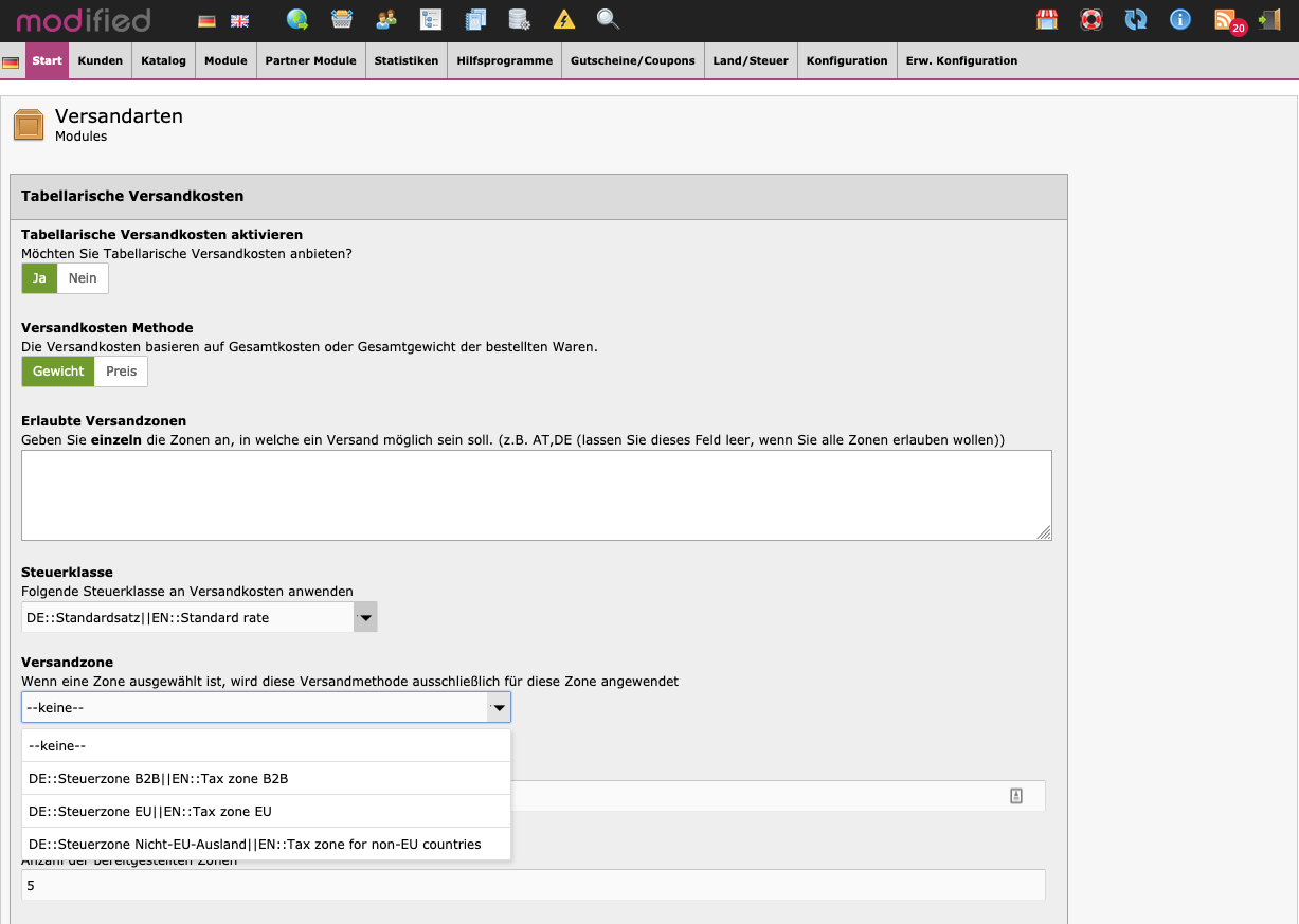 Die Steuerklasse & Versandzone in Versandmodulen, sowie Zahlungszone in Zahlungsmodulen wird derzeit nicht mehrsprachig ausgegeben, sondern so, wie wir es in die Datenbank schreiben, siehe Screenshot.