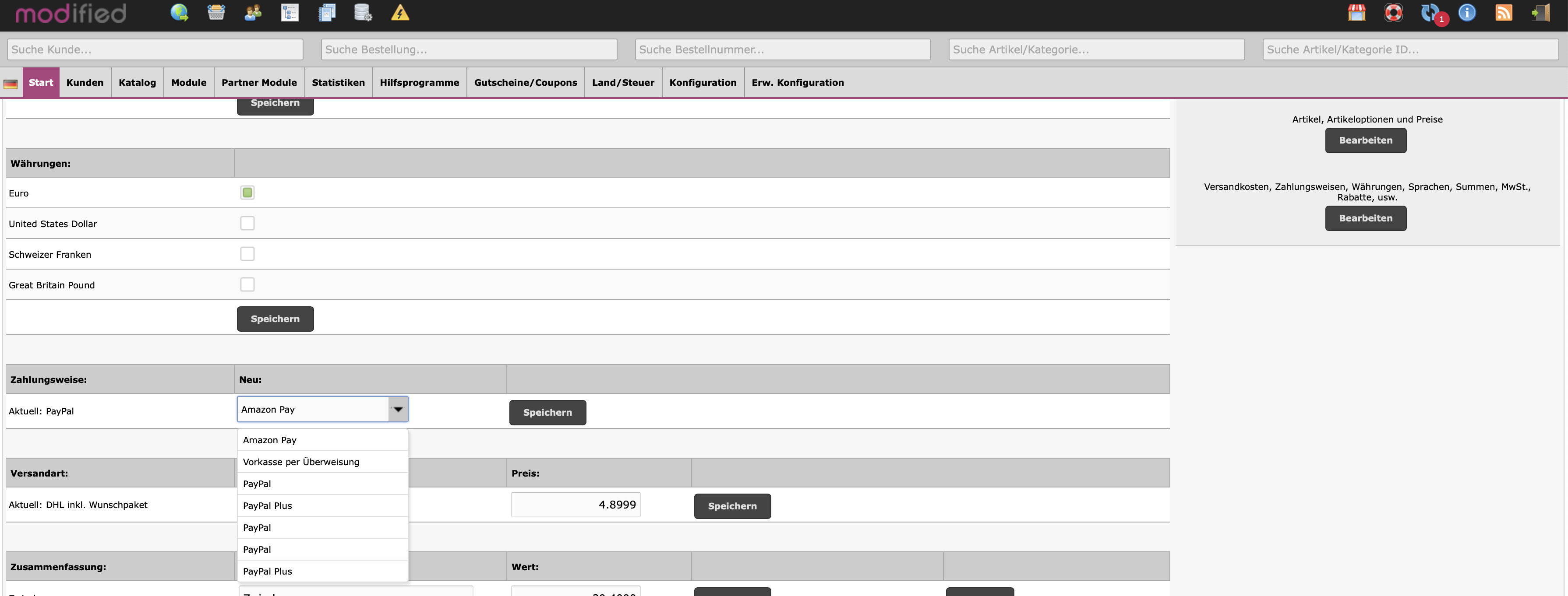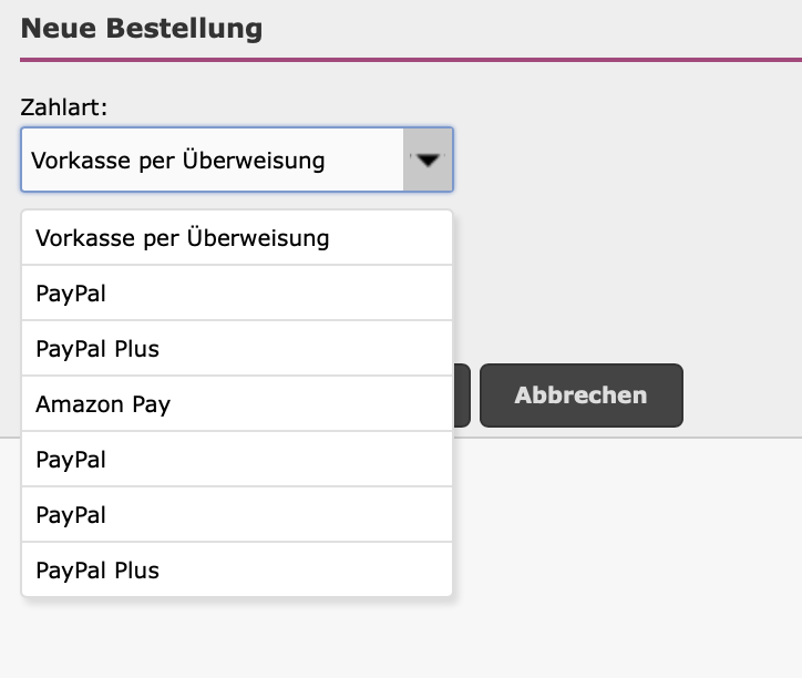 Seit Modulversion 1.63 sind die Modulnamen fast gleich und lassen sich nicht mehr unterscheiden, wenn man eine neue Bestellung manuell anlegt oder in einer bestehenden Bestellung die Zahlungsart ändern möchte.