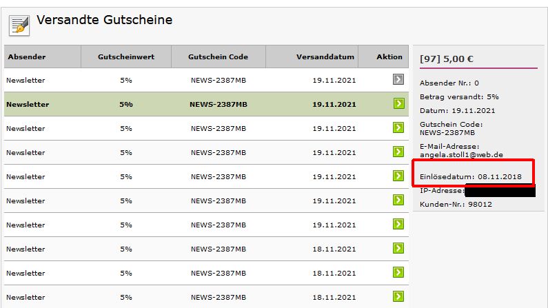 In der Übersicht im Admin unter Gutscheine/Coupons -> Gutscheine versandt ist die Info zur Einlösung nicht immer korrekt.