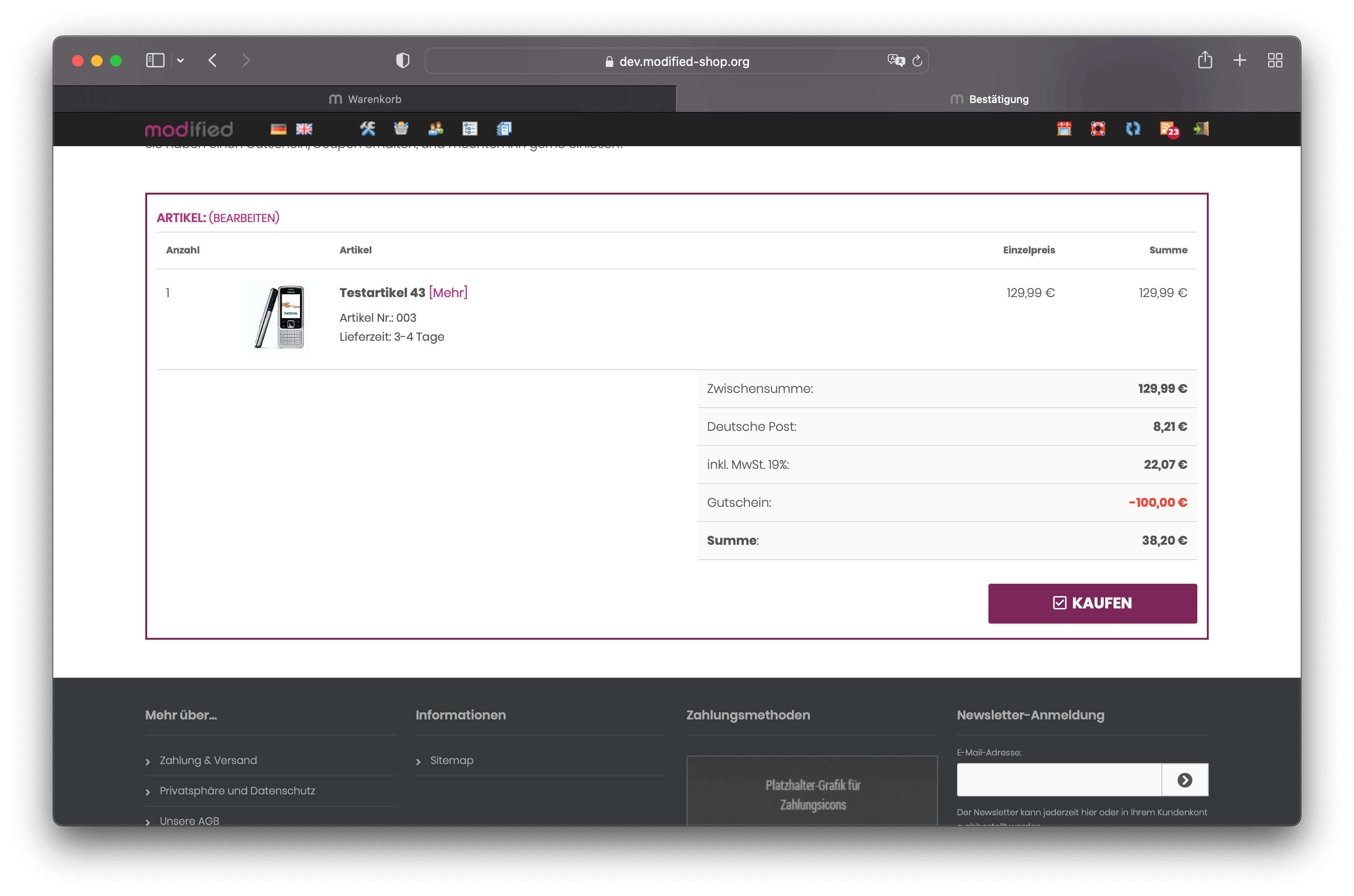 Ust. Gutschein im Warenkorb hat da überhaupt nichts zu suchen, so wie auch der Gutschein nicht. Im Warenkorb steht die Ware und nicht irgendwelche Gutscheine.