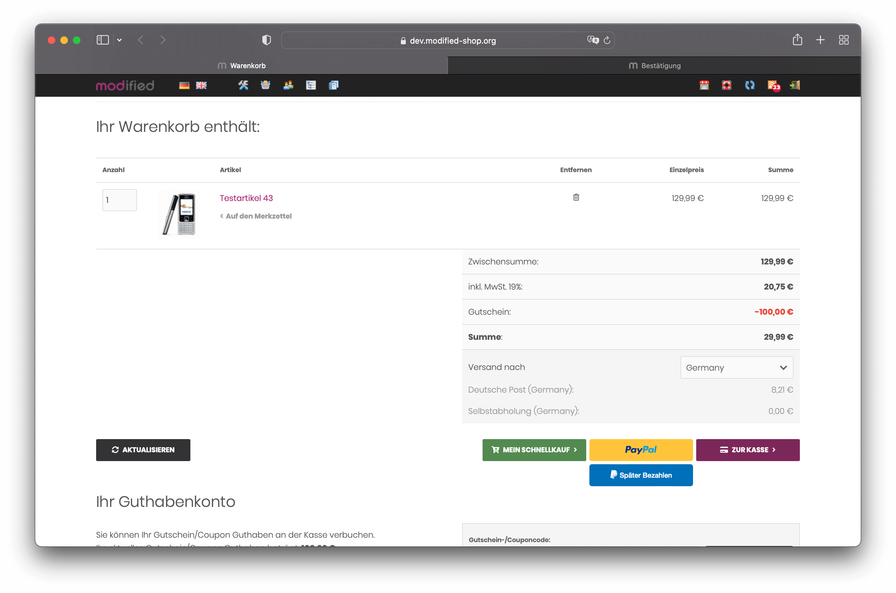 Gutscheinwert im Warenkorb