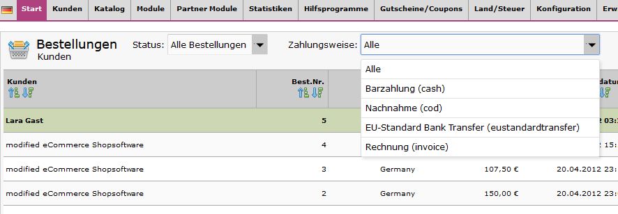 Sortierreihenfolge Bestellungen - Dropdown "Zahlungsweise"