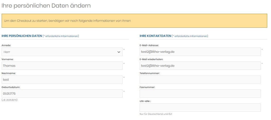 Bei Kontoanmeldung ist es möglich ein Geburtsdatum von 1795 anzugeben, also besser gesagt egal welches Jahr. Erst bei einem Einkauf wird über die Checkout da was geprüft und die Fehlermeldung im Anhang ausgegeben, die aber den Fehler nicht zeigt. Der Kunde kann erstmal raten ob er nicht doch fehlende Firmenangaben machen muss auch wenn sie irrational sind.
