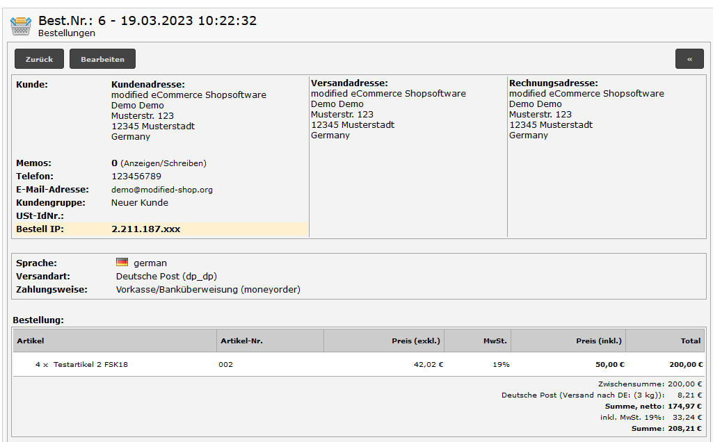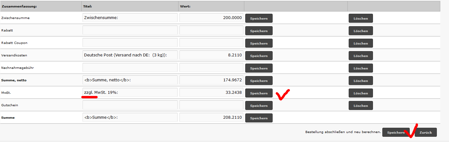 Bearbeitung des MwSt.-Textes einer Bestellung wird nicht übernommen.