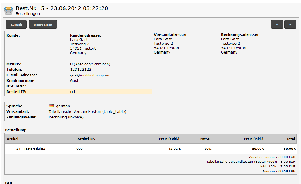 Bezugnehmend auf das Ticket #2031 habe ich festgestellt, dass wenn eine Bestellung über 150 EUR getätigt wird, standardmäßig erst die Netto-, dann die MwSt mit dem Text "inkl. MwSt" und danach die Bruttosumme angezeigt wird. Möchte man jetzt nachträglich den Text "inkl. MwSt" auf "zzgl. MwSt" ändern, wird diese Änderung NICHT übernommen. Dies muss händisch direkt in der DB gemacht werden.