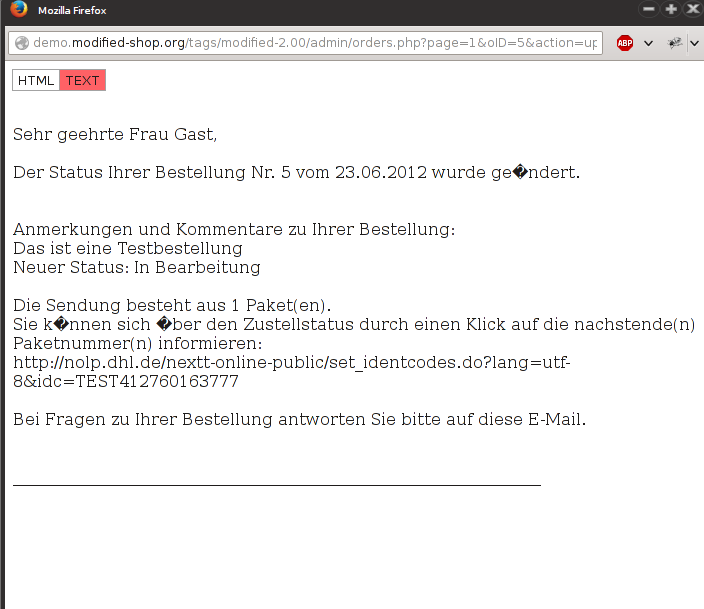 Die Umlaute in der Textversion der Mailvorschau in der Bestellbararbeitung der Textvorlage im Demoshop werden fehlerhaft angezeigt.