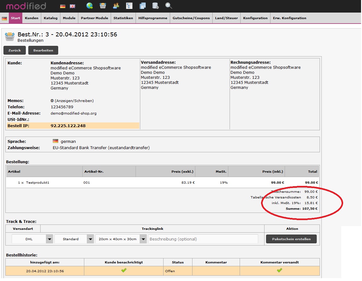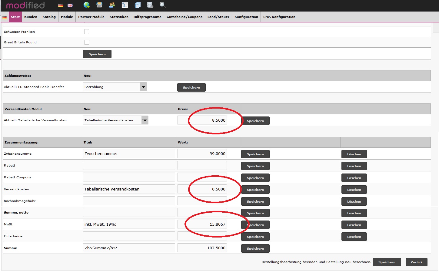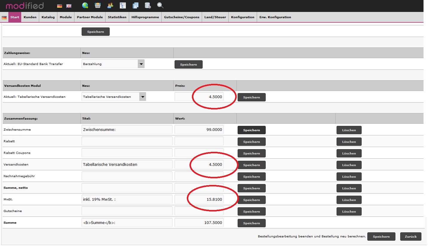 Beim Bearbeiten von Bestellungen (Versandkosten, Zahlungsweisen, Währungen, Sprachen, Summen, MwSt., Rabatte, usw.)wird die USt. nicht neu berechnet und somit falsch ausgewiesen...
