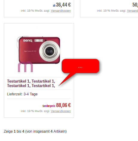 - Wenn ich einen recht Langen Artikelnamen habe und mir diesen Artikel dann in der Kategorieübersicht (Box-Listing) anschauen, wird ein großer Teil des Artikelnamen abgeschnitten, was ja auch ok ist, jedoch sollten dahinter noch 3 Punkt (Testartikel 1, Testartikel 1, Testartikel 1, Testartikel 1...) gesetzt werden.