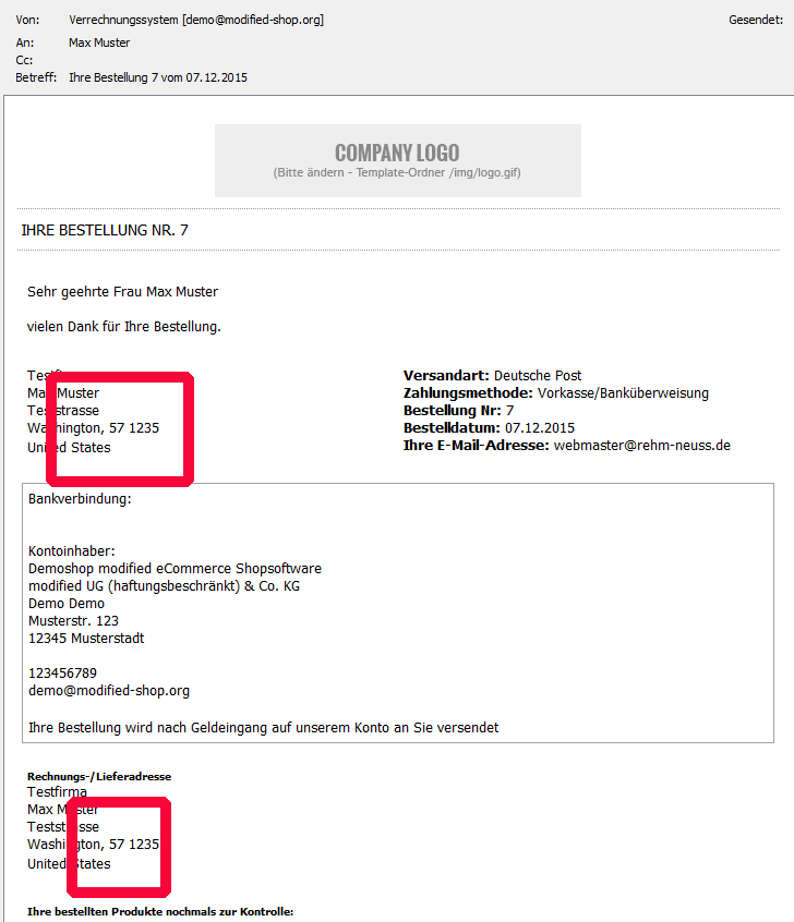 Das Bundesland fehlt in der Mail an den deutschen Kunden (was ja noch ok ist) ... im 2. Screen ist die Bestellung mit einer US-Adresse. Hier kommt in der Mail ebenfalls kein Bundeland an sondern lediglich die "57" für Texas.