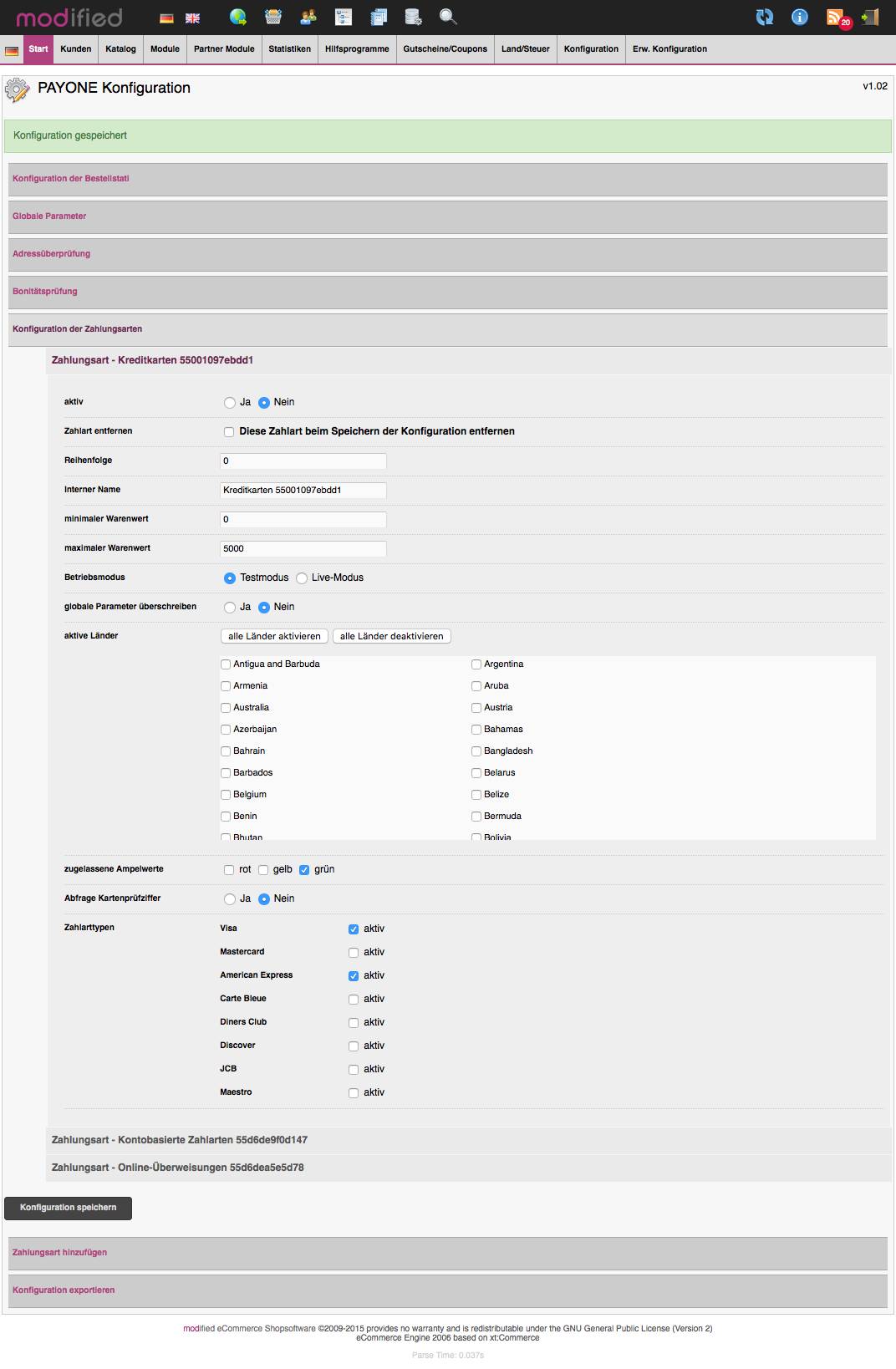 Konfiguriert man beispielsweise PAYONE Kreditkarte für die Zahlarttypen "Visa" & "American Express", so ist es nicht möglich einen der gesetzten Haken nachträglich wieder zu entfernen.