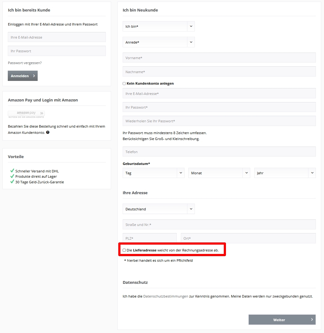 Abweichende Lieferadresse schon bei der Kontoerstellung eingeben